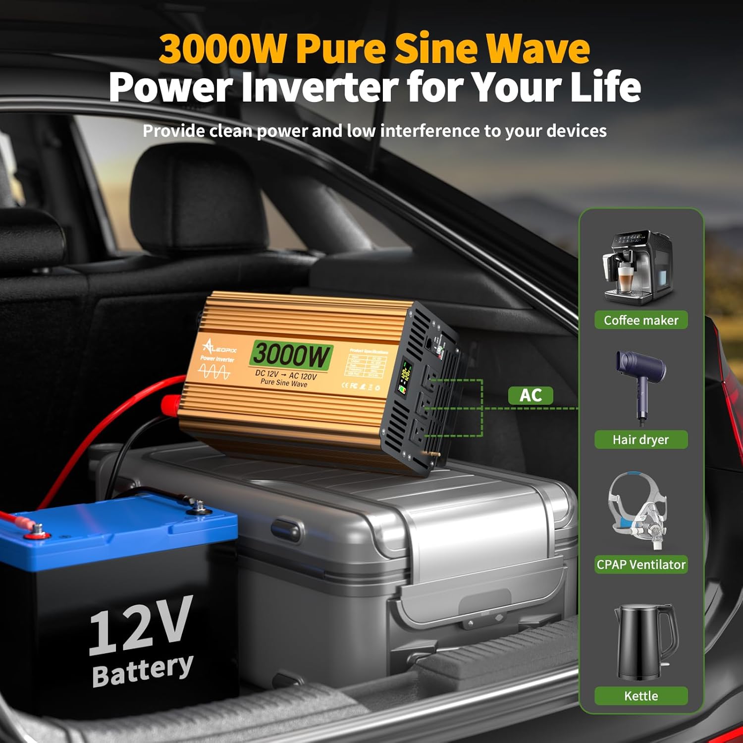 3000 Watt Inverter 12V to 110V/120V, Power Inverters for Vehicles, Car Inverter with Remote LED Display 2 AC Outlet 3.4A USB Port, Converter Inverters for Home RV Truck Solar System by ALEOPIX