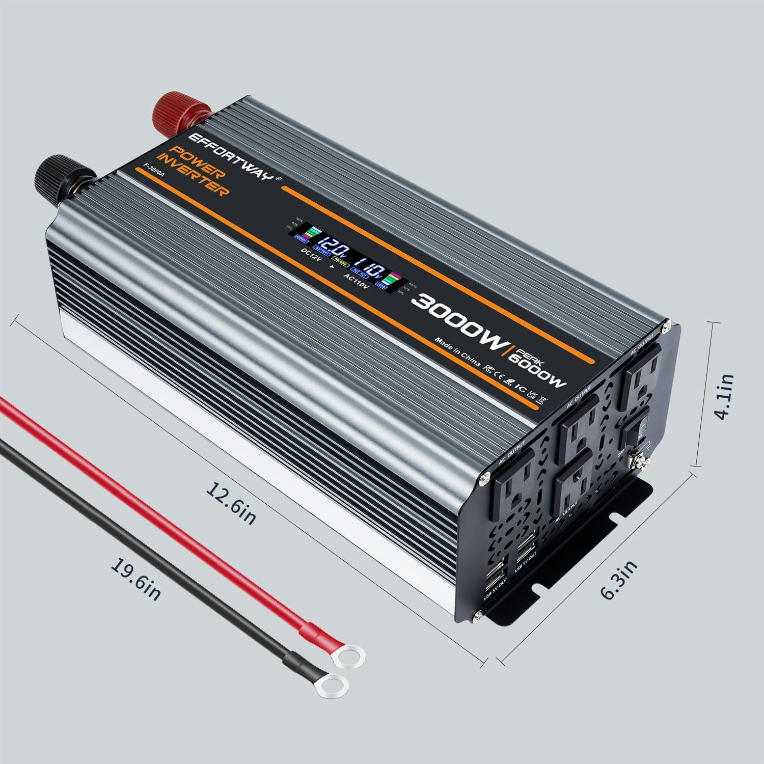 This EFFORTWAY 3000 watt power inverter takes 12 Volt DC power and changes it to 110V/120 Volt AC power, like what you use at home. It can handle a peak of 6000 watts for a short time. It has a screen to show you what’s happening, and you can even control it without touching it using a wireless remote. There are four regular plug spots and four USB ports to power many things. This inverter is good for RVs, camping trips, and places that don’t have regular electricity from the power company, like solar power setups.