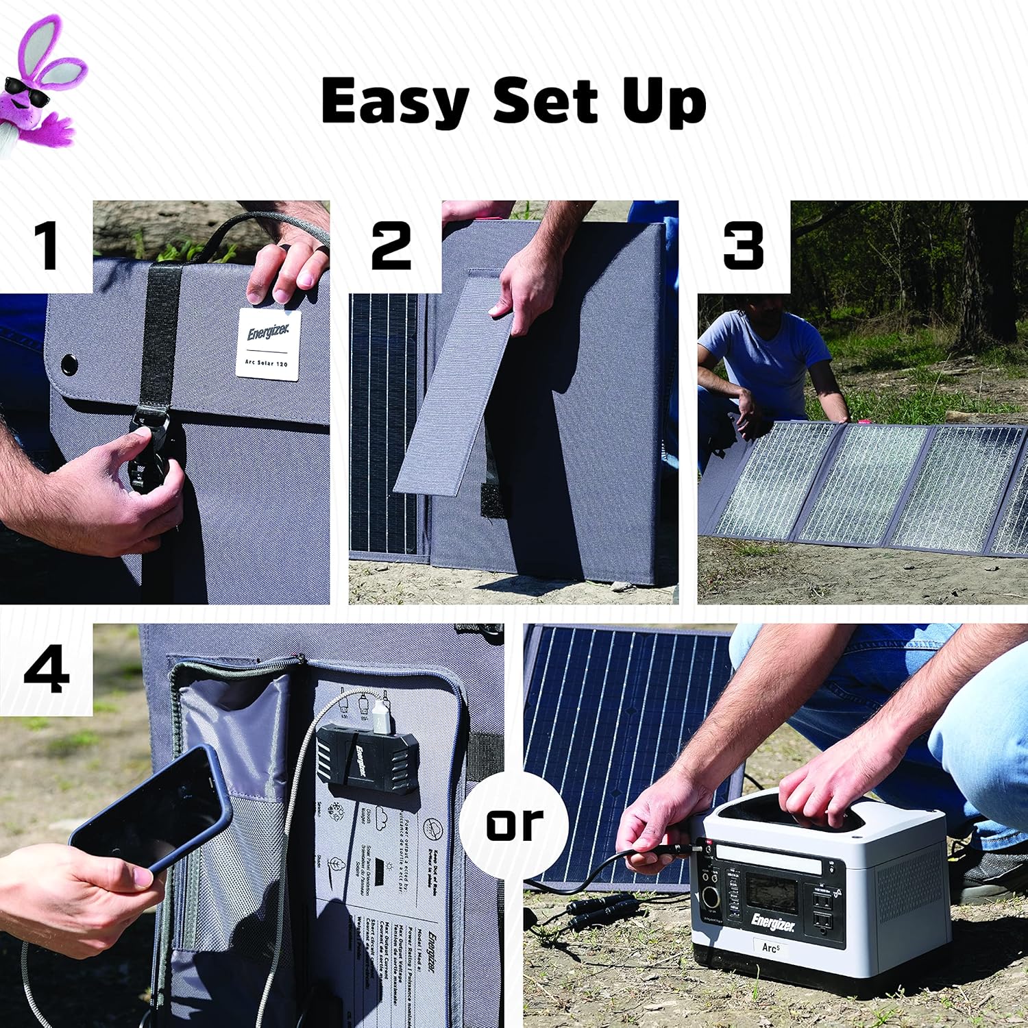The Energizer Arc Solar 120 is a solar panel that can collect energy from the sun. It can make up to 120 watts of power. It can fold up, so it is easy to carry around. It is also light. You can use USB ports to charge phones and other small devices. It has other kinds of plugs too, called MC4 and jack connectors. This solar panel can handle different weather. It is simple to set up. You can use it to charge 12 Volt batteries. It comes with a 2-year promise that it will work.