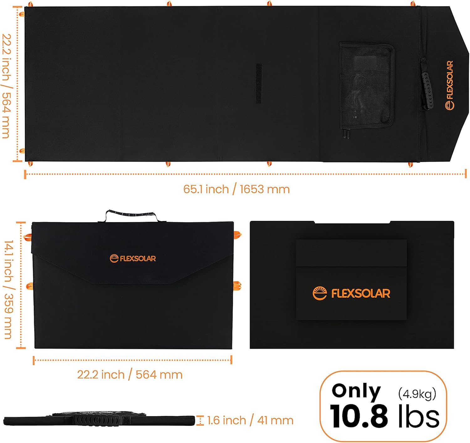 • ✅ 6 folds and 2.6lbs(1.2KG) low weight with junction box and accessories . The unfold size is 54.8 x 12 x 1 inch, the fold size is 9.8 x 12 x 1 inch which is similar size with laptop and makes it easy to unfold to collect power and folded with handles to carry away or put in your backpack. Although it is not very heavy, but is a little burden for hiking, more suitable for camping and driving trips or home emergency power. Note:Don't have Kickstand.