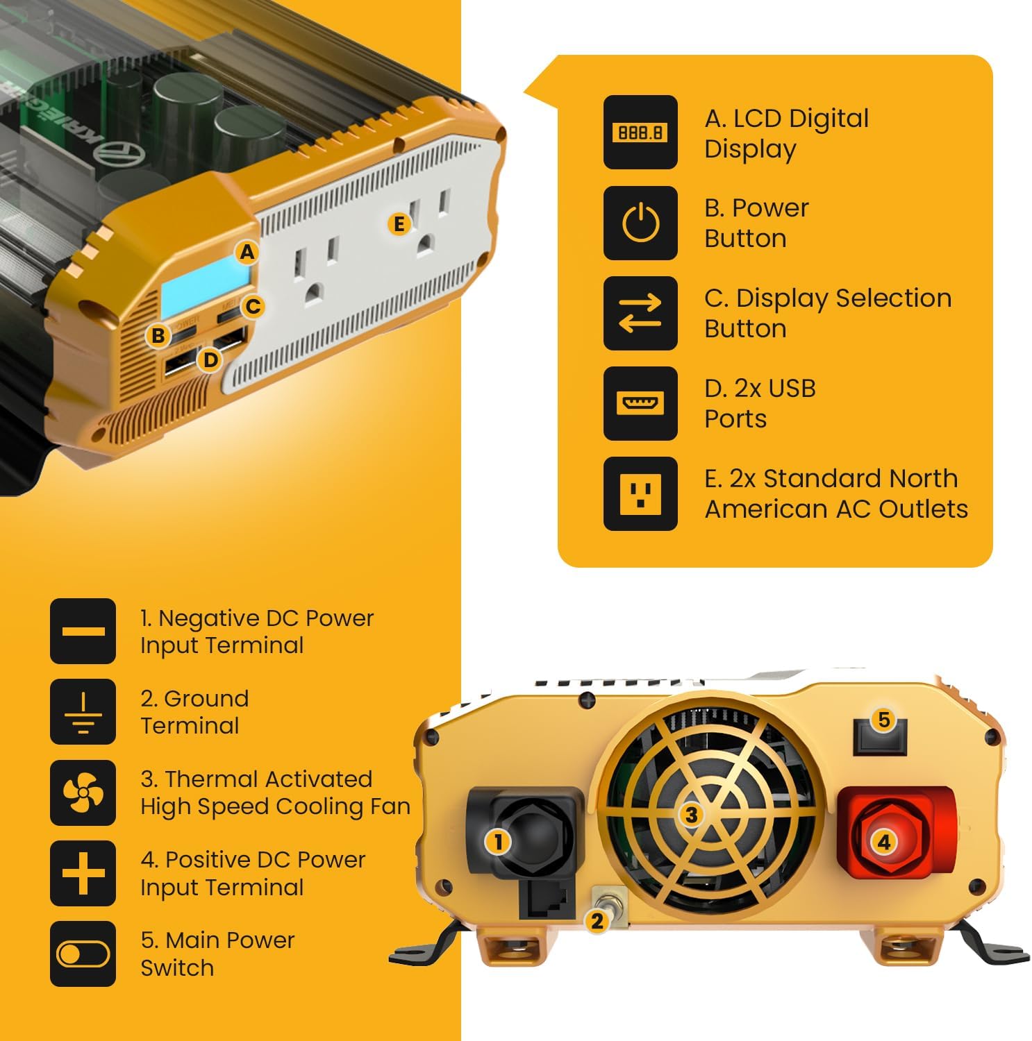 • ✅ Overall Protection - We've got you covered! Krieger pure sine wave power inverter has all the protections that you will need: Battery Output, Input Voltage, Output Wattage, Temperature Overload, and Warning Indicators which can be seen in the LCD Display. The ultra-silent cooling fan is an added feature so you don't worry about operating a noisy power inverter.