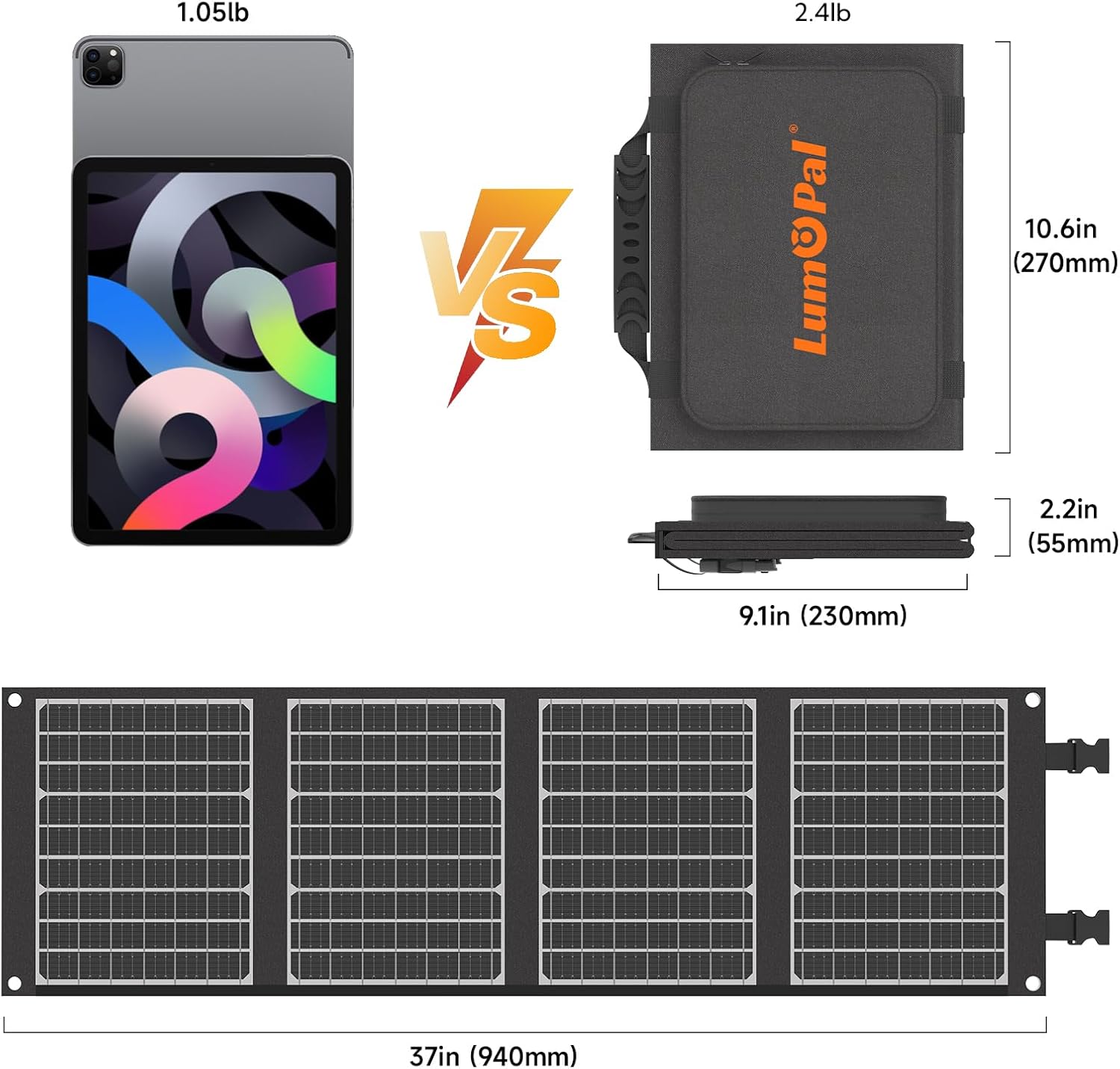 • ✅ Ultra Portability & Compact- Experience unmatched portability with the upgraded LUMOPAL portable solar panel. Weighing only 2.4 pounds and folding down to a compact size of 10.6*9*2inches, it delivers up to 40W of power. The ultra compact design ensures you can easily store it in your backpack, travel bag, or any other storage space. Upgrade your outdoor power solutions with the 40W foldable solar panel today – where portability meets performance!