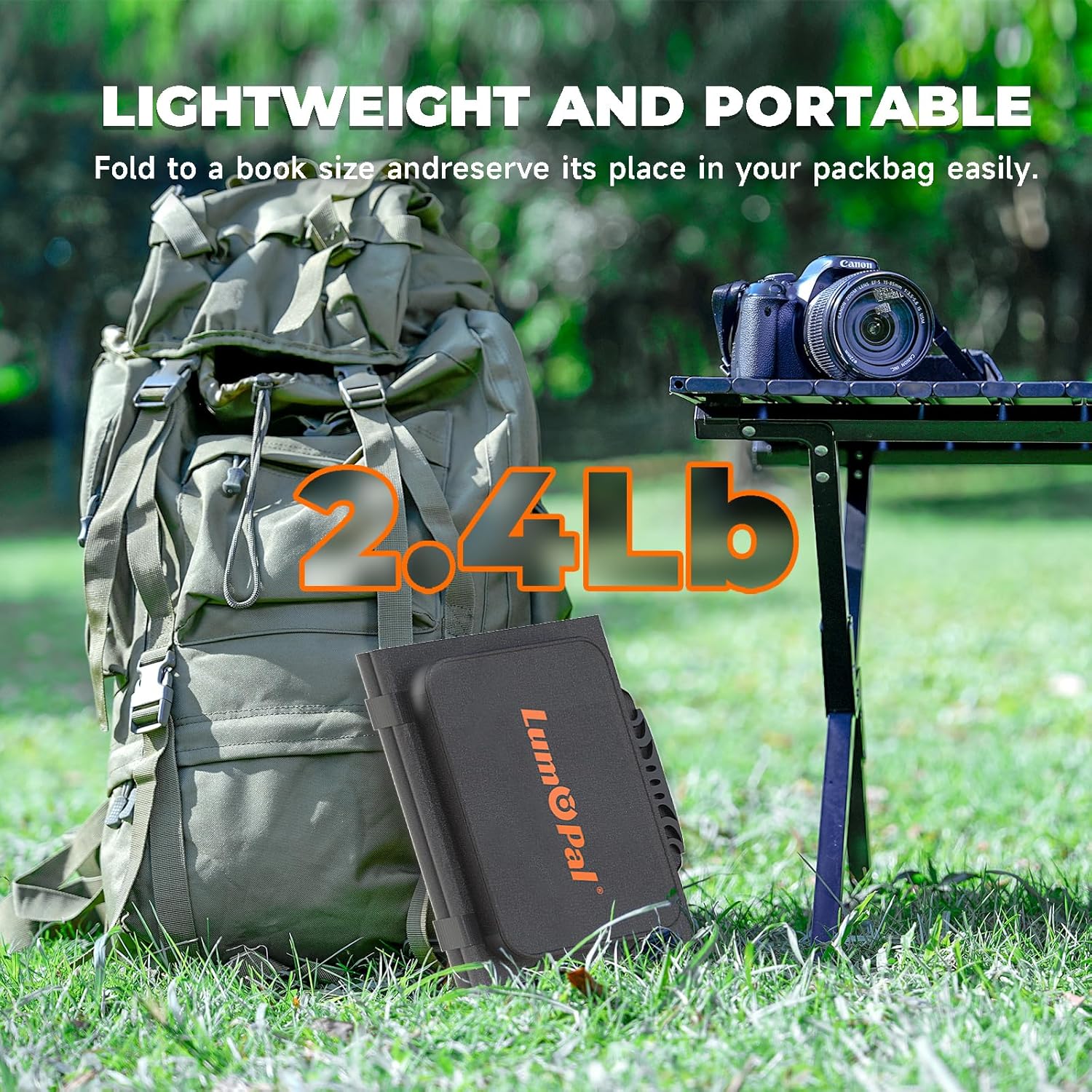 • ✅ Foldable and Portable - The LUMOPAL solar panel kit is foldable and measures only 6.7*9.5in when folded, and weighs only 3.42lb, making it portable and lightweight enough to fit into any camping or travel backpack.