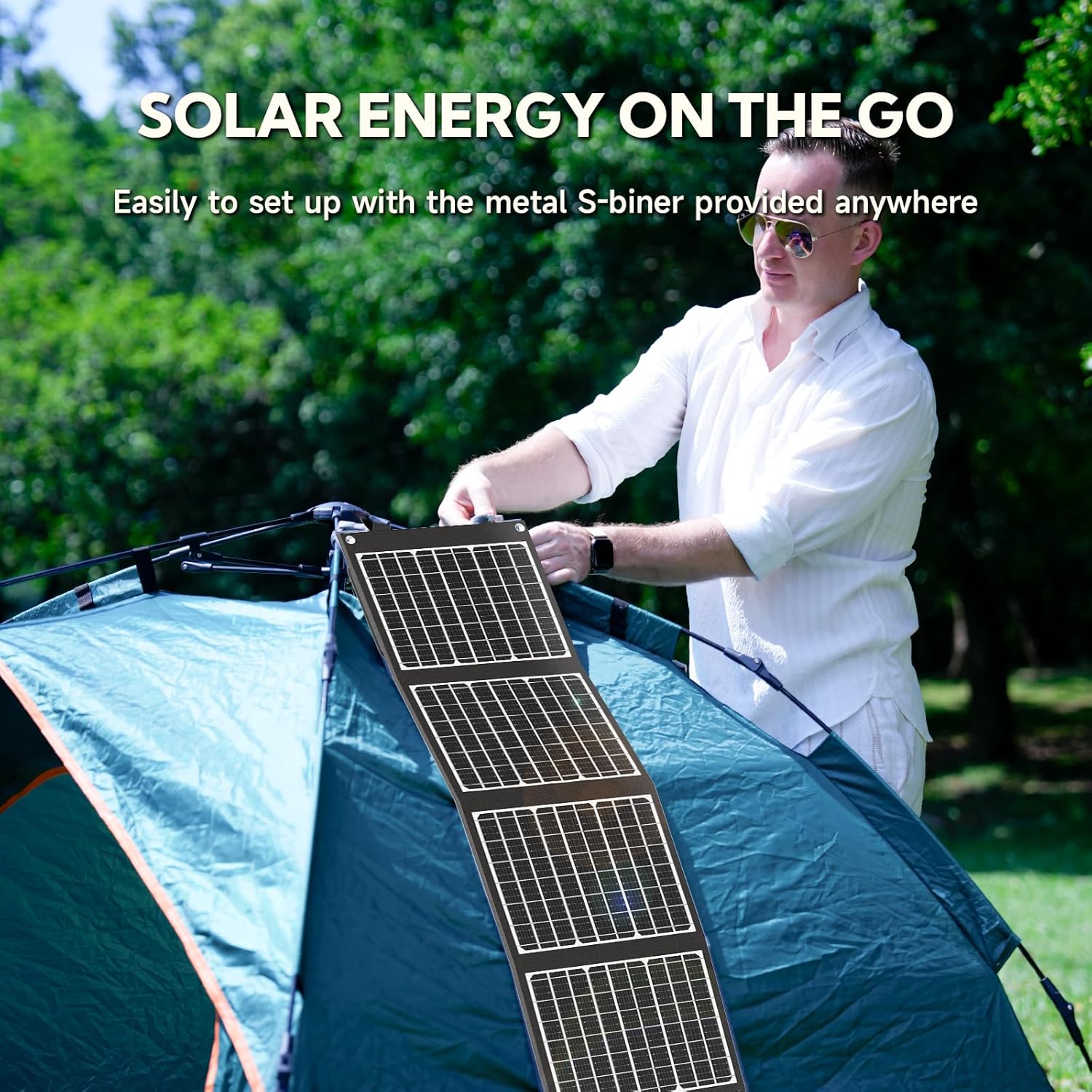• ✅ 23.5% High Efficiency & IP65 Water Resistance - Made from premium monocrystalline silicon, this 40W foldable solar charger boasts a high conversion efficiency of up to 23.5%, effectively converting solar energy into electrical power. The ETFE laminated surface ensures higher durability and resistance to wear and dirt compared to PET solar panels. Coupled with waterproof nylon fabric and waterproof zippers, it's a reliable partner for outdoor hiking, camping, RV trips and backpacking.