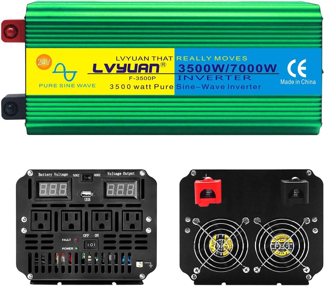 The LVYUAN 3500 watt Pure Sine Wave Inverter changes 24-volt battery power into regular 110/120-volt house electricity. It provides a steady 3500 watts of power, which is enough for many electronics. This inverter has four regular wall-style outlets and one USB port for charging. It’s a great choice for using your electronics when you’re camping, in a truck or RV, or as part of a solar power system.
