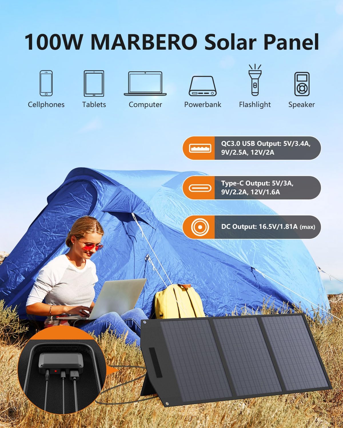 MARBERO 100W Portable Solar Panel 100 Watt Foldable Solar Panel for Power Station with USB & DC 18V Output(10 Connectors) 23% Conversion Efficiency IP68 Waterproof for Camping Outdoor Home Cloudy