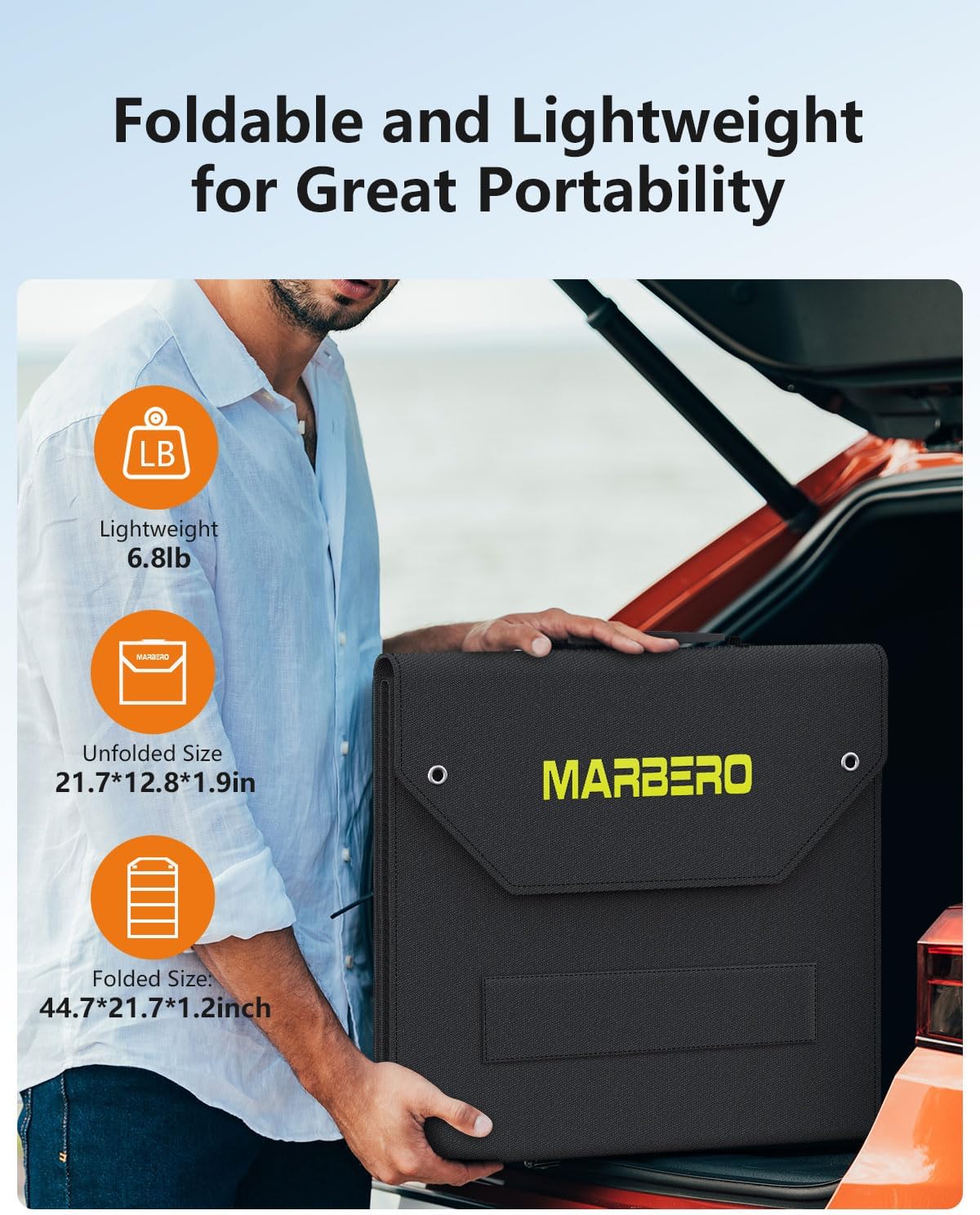 • ✅ PORTABLE, FOLDABLE & EASY TO CARRY: The MARBERO portable solar panel is compact and lightweight, with a folded size of 11.4" x 6.3" x 1.3" and weighing just 1.32 lbs—smaller than an iPad Pro. It easily fits into any camping backpack or hiking daypack, or can be carried by hand, making it perfect for outdoor activities like camping, traveling, or any occasion when you need it. Designed with 4 attachment holes, this foldable solar charger can be conveniently hung anywhere using the included carabiners.