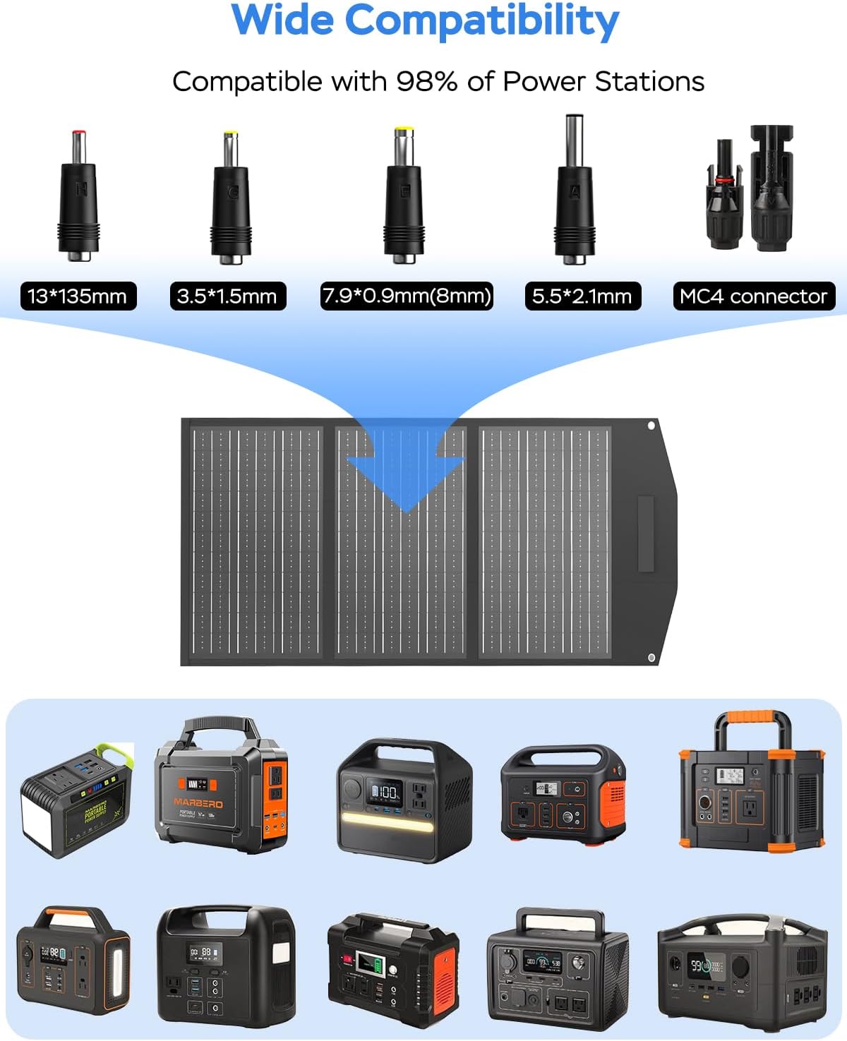 • ✅ WIDE COMPATIBILITY: 100 Watt solar panels comes with 4 adapter connectors—XT60, Anderson, DC5521(5.5×2.1mm), DC35135 (3.5×1.35mm) and DC7909(8mm)—along with a 6.4ft DC5521 dual way solar cable, ensuring semaless compatibility with most portable power stations/solar generators on the market. Anderson & XT60 Adapter works with ECOFLOW (DELTA & RIVER SE), Anker SOLIX C1000, BLUETTI (AC200P/AC200MAX/EB150/EB240) and Jackery Explorer (1000/1500/2000 Pro), DC35135 Adapter fits MARBERO 80W/100W/200W; DC5521 Adapter works for MARBERO 300W & FlashFish 200W/300W and DC7909 Adapter is for Jacckery Explorer (160/240/300/500/1000).