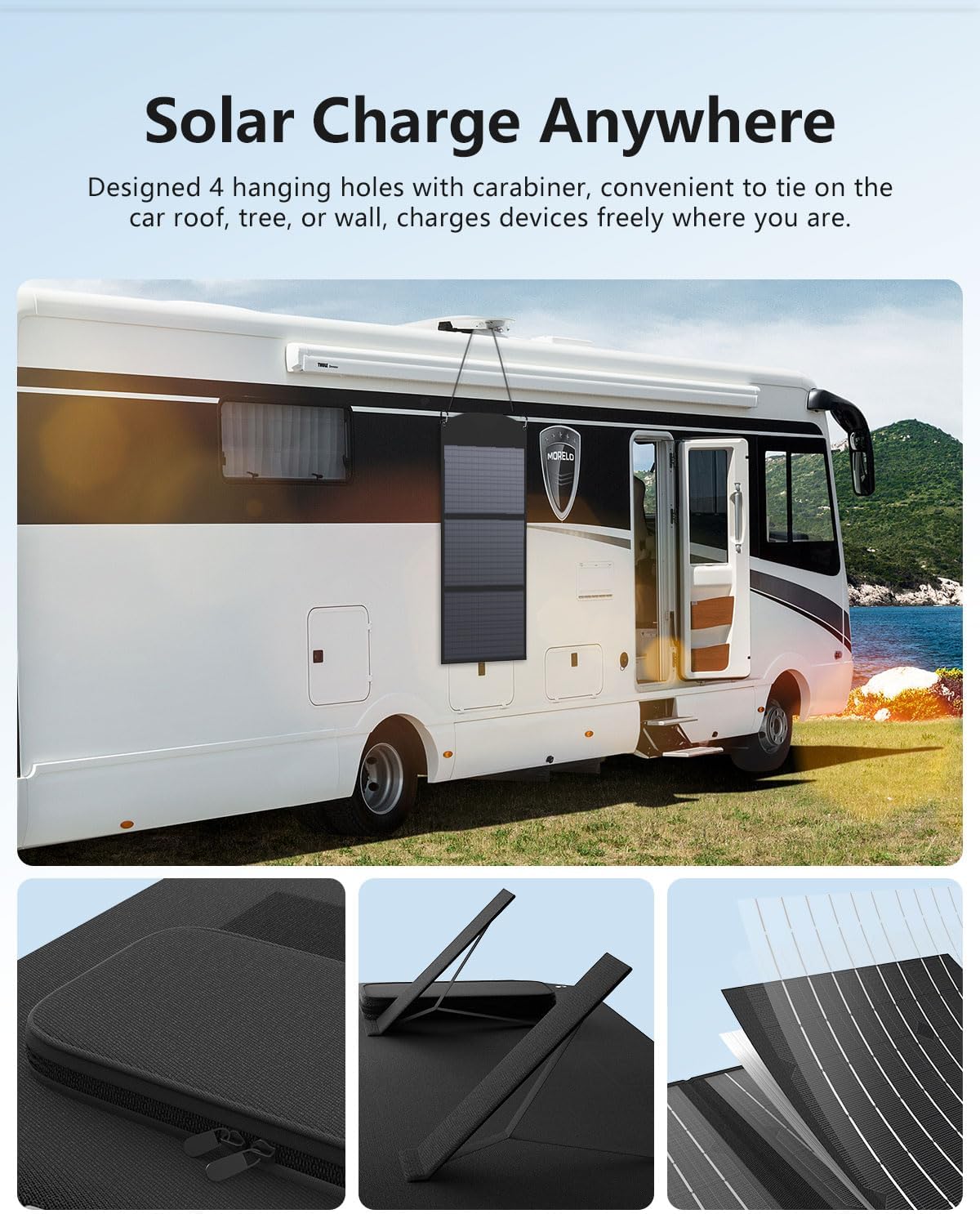 • ✅ 【TRAVEL LIGHT, POWER ANYWHERE】 Weighing only 6lb and folding to 19*26*0.5in, this 100W panel is easy to carry, store, or hang—perfect for RVs, vans, tents, and emergency backup power.