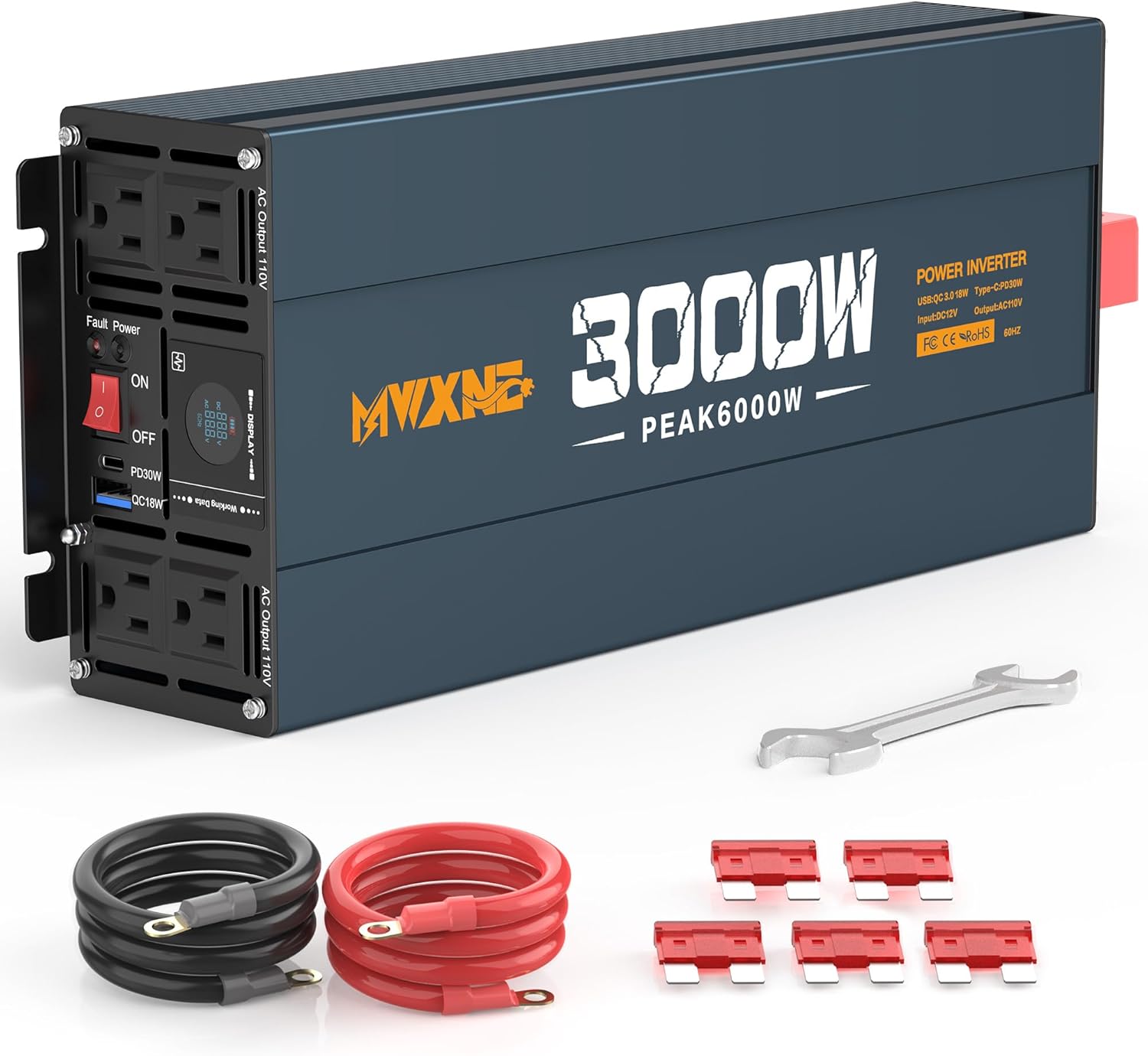 MWXNE 3000W Pure Sine Wave Power Inverter DC 12V to 110V 120V with Fast Charging Type-C& 3 USB Ports LCD Display Remote Controller Power Inverters for Vehicles,RV,Truck,Home,Off-Grid Solar System