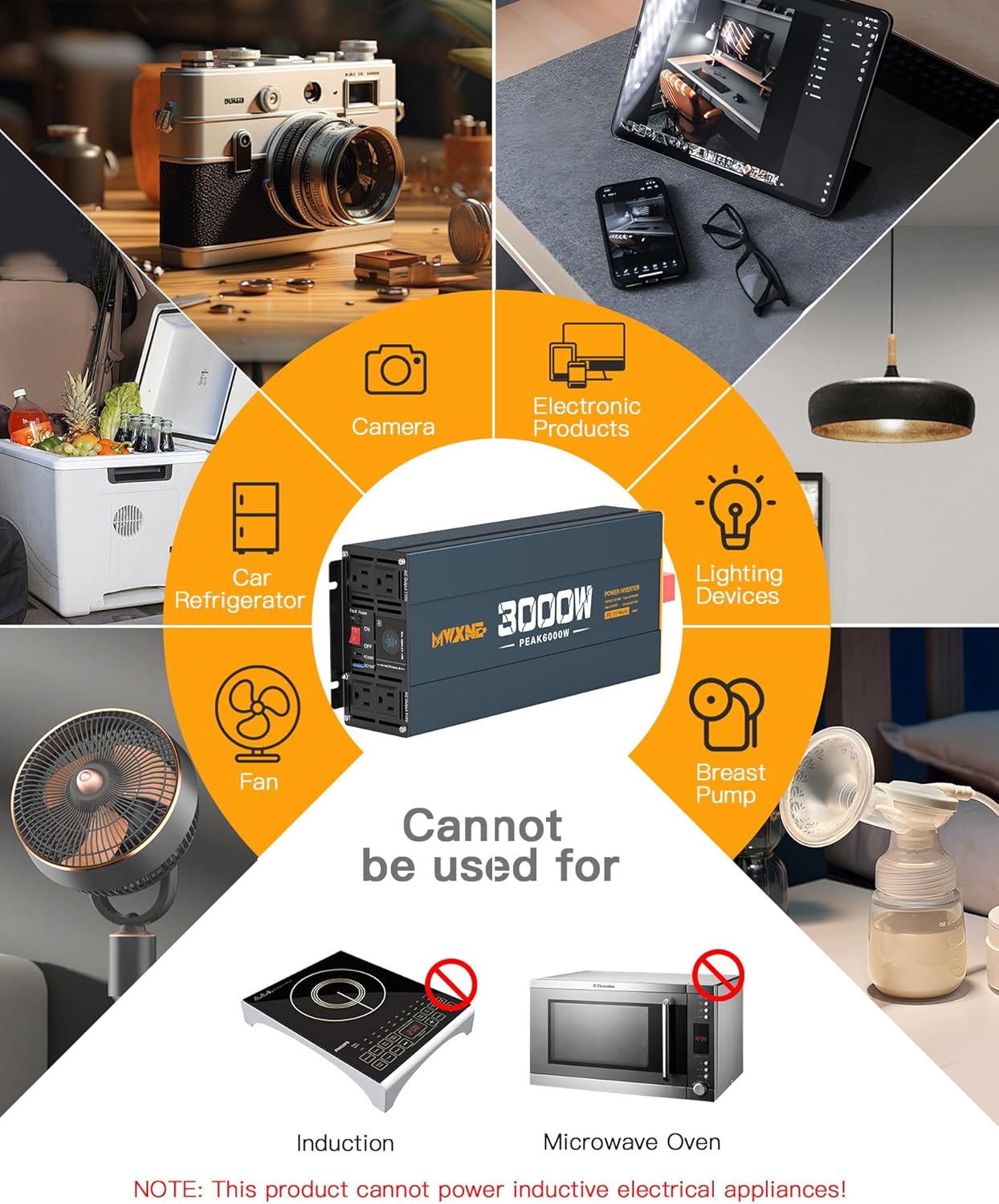 • ✅ 【The 3000W Power Inverter】The MWXNE inverter converts 12V DC to 120V AC, providing 3000W of continuous power and 6000W of peak power. It features dual AC outlets and 2 USB ports to fulfill all your power needs.