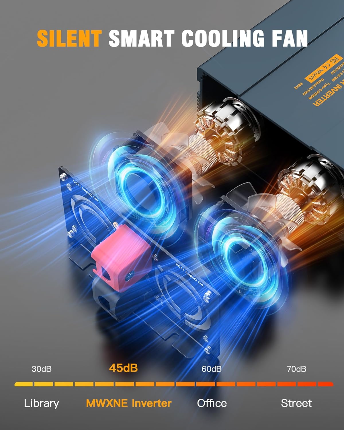 • ✅ 【Dual Intelligent Fans and Low-Noise Operation】 Advanced dual intelligent temperature control cooling fans can quickly reduce the machine temperature, so that the inverter shell is not hot, and the operation is quiet, which is suitable for use in the home environment, but also to meet the needs of the complex outdoor environment.