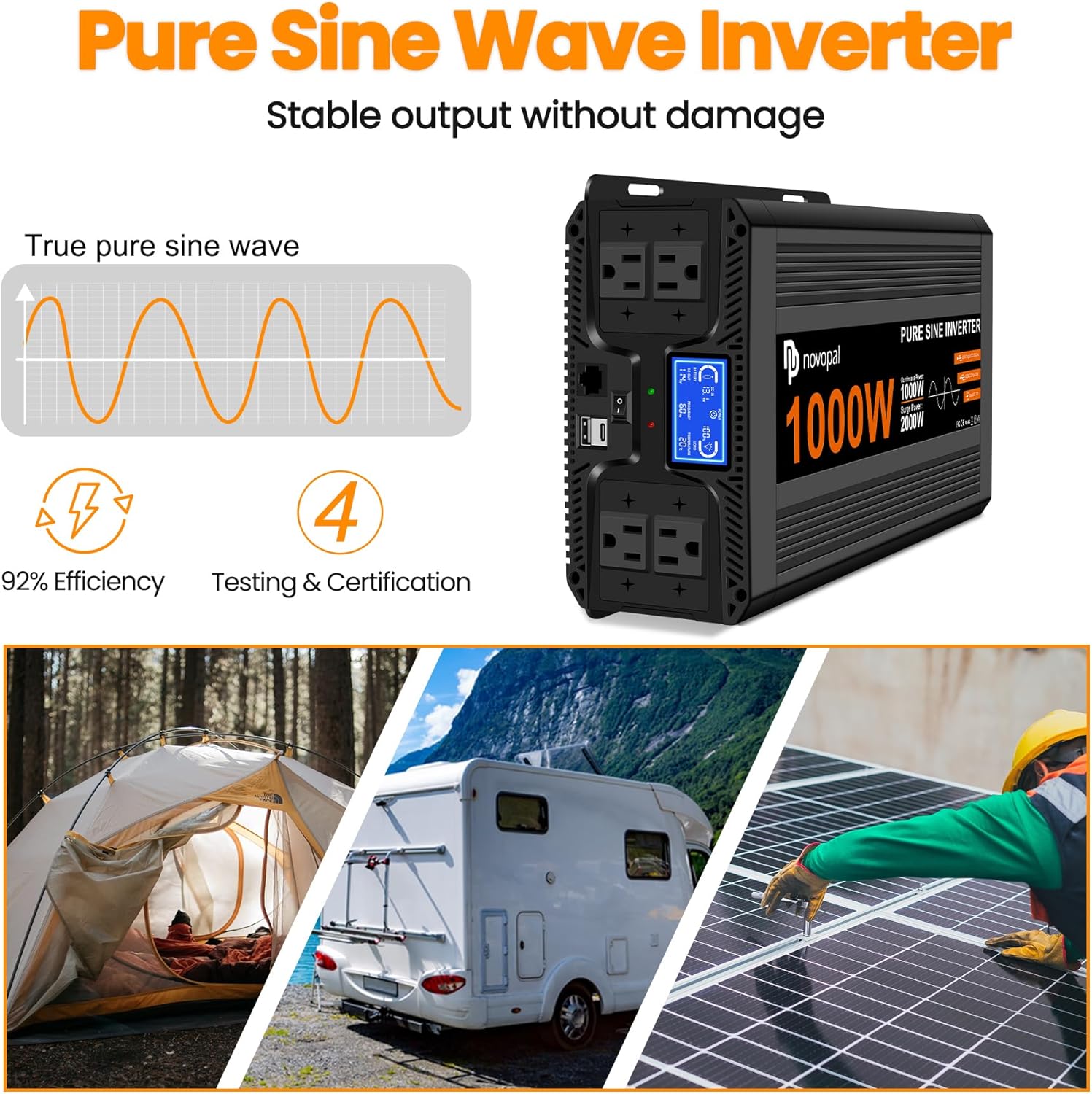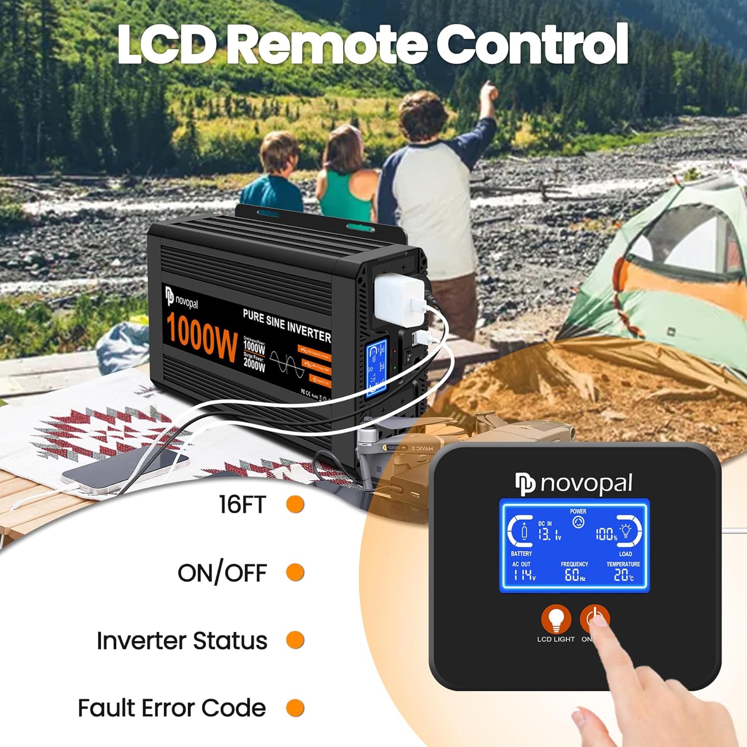 This Novopal 1000 watt power inverter changes 12 Volt DC power to 110 Volt or 120 Volt AC power, like what you have at home. It uses a pure sine wave, which is good for running sensitive electronics. You can use it in your house, RV, or truck, and it’s ready for off-grid setups. It has four regular outlets, a USB port, and a Type-C port for charging your devices. It also comes with a remote control and a screen that shows you important information.