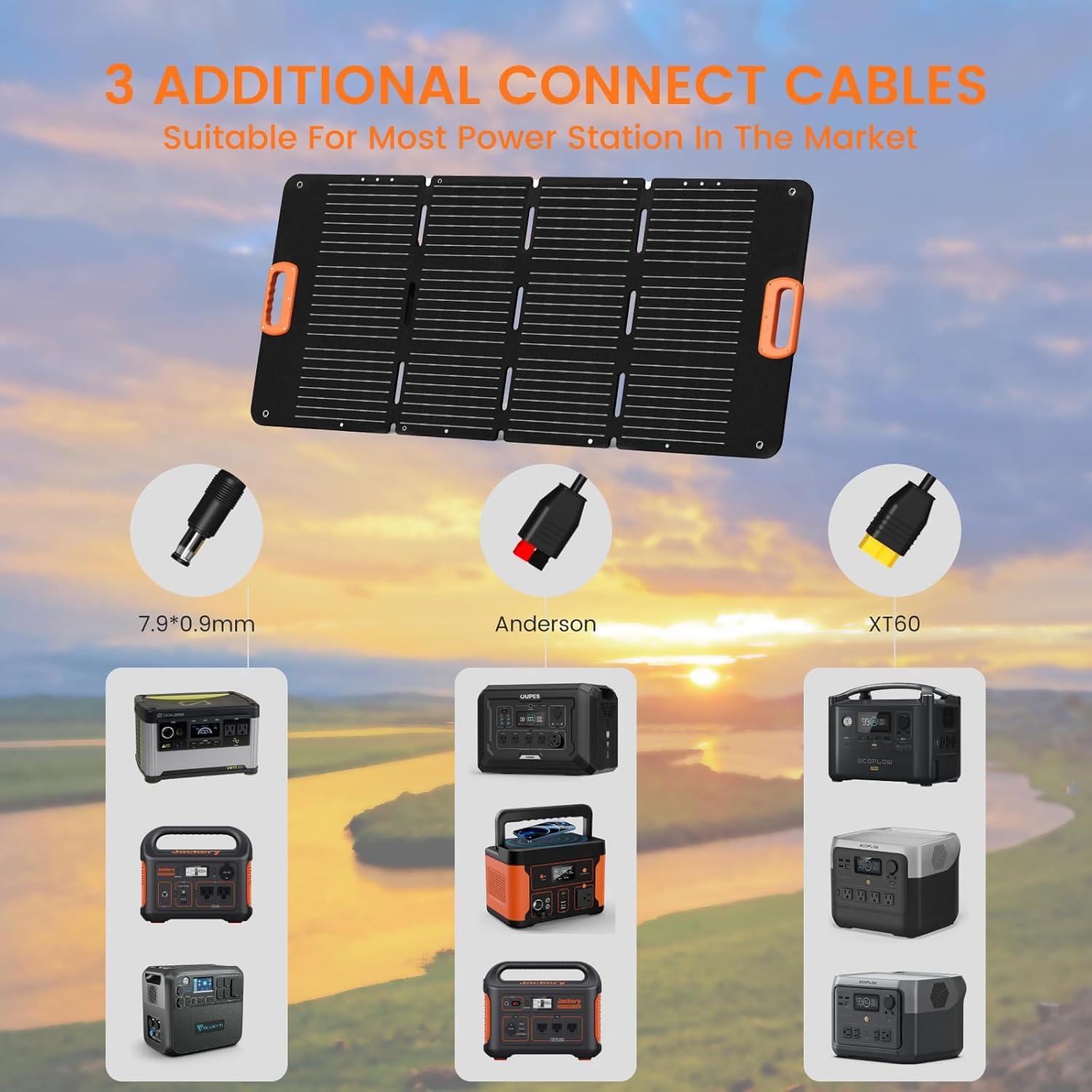 • ✅ WIDE POWER STATION COMPATIBILITY: Equipped with IP68 solar connectors and a versatile 4-in-1 cable, this 100W solar panel seamlessly connects to most portable power stations on the market. You can also expand your options with a charging controller and alligator clips (sold separately) for 12V/24V battery systems.