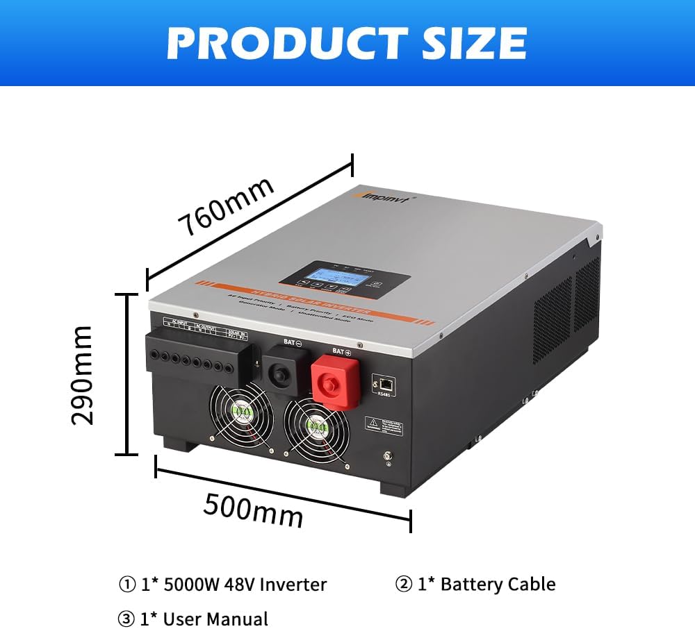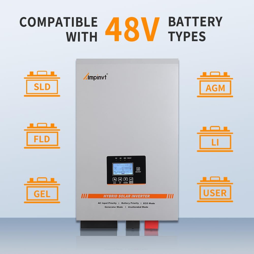 This OAE Ampinvt 5000 watt hybrid solar inverter can take power from solar panels, batteries, or the regular electricity grid. It changes 48 Volt DC power from batteries or solar into 120 Volt or 240 Volt AC power for your home. It has a built-in 100A MPPT controller to get the most power from your solar panels. This inverter is designed to work without being connected to the main power grid and produces a clean “pure sine wave” of electricity, which is good for sensitive electronics. It’s made for use with lead-acid, lithium, or gel batteries.