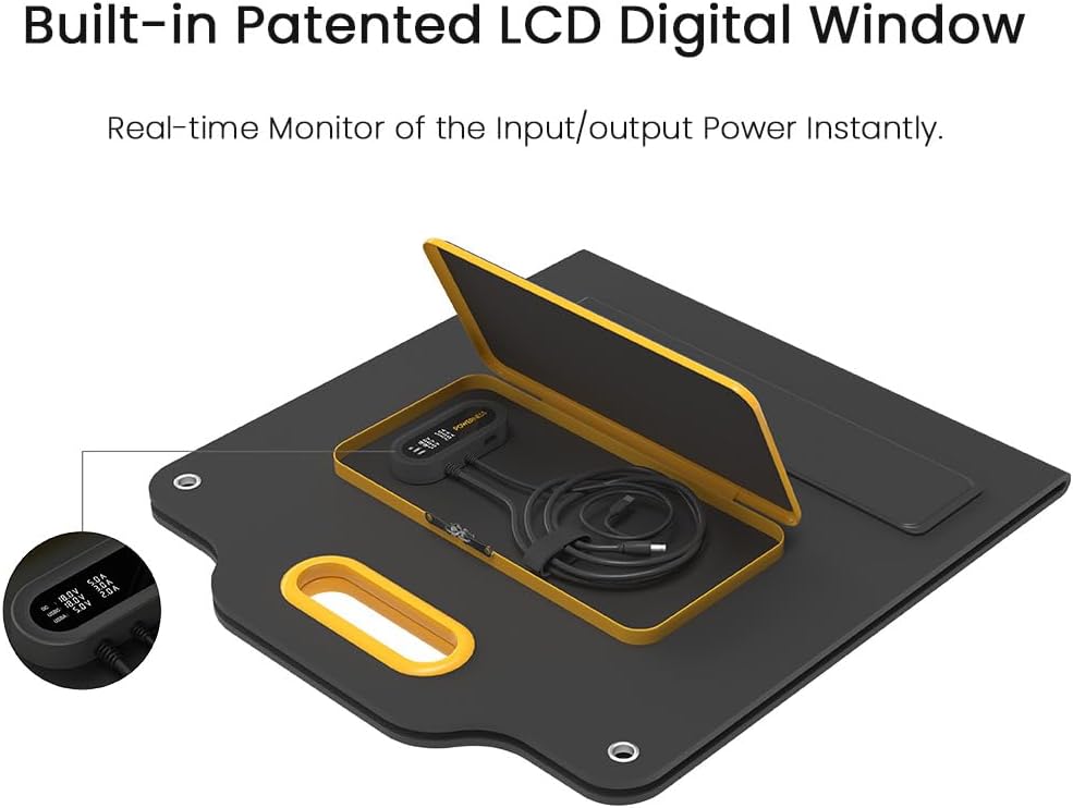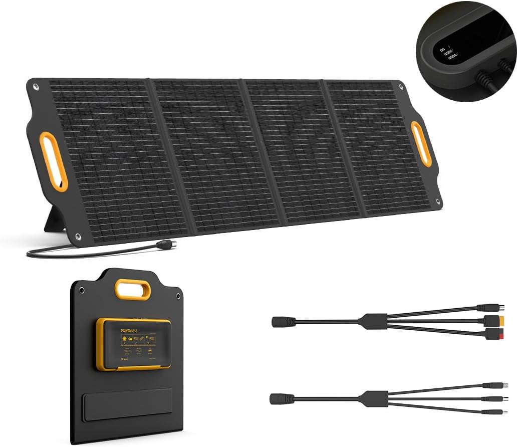 This Powerness 200 Watt solar panel is a foldable and portable charger. It can use sunlight to power up devices like phones and power stations. It has a screen that shows how well it’s charging. It has different kinds of plugs, including USB-A and USB-C, so it can work with many devices. It’s good for camping, RV trips, and being outdoors.