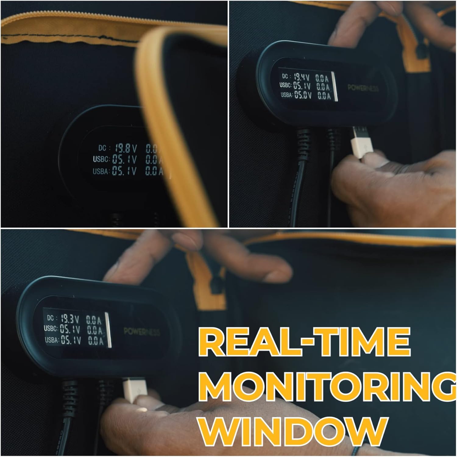 The Powerness 200 watt Portable Solar Charger is like sunshine you can fold up and carry. It soaks up energy from the sun. Then it turns that energy into power for your devices. This solar panel is great for camping. It also works well for RV trips and outdoor adventures. The Powerness 200 watt Portable Solar Charger has a screen. This LCD digital window shows you how much power you are getting. It also helps you position the panel just right. This way, you get the most sunlight.