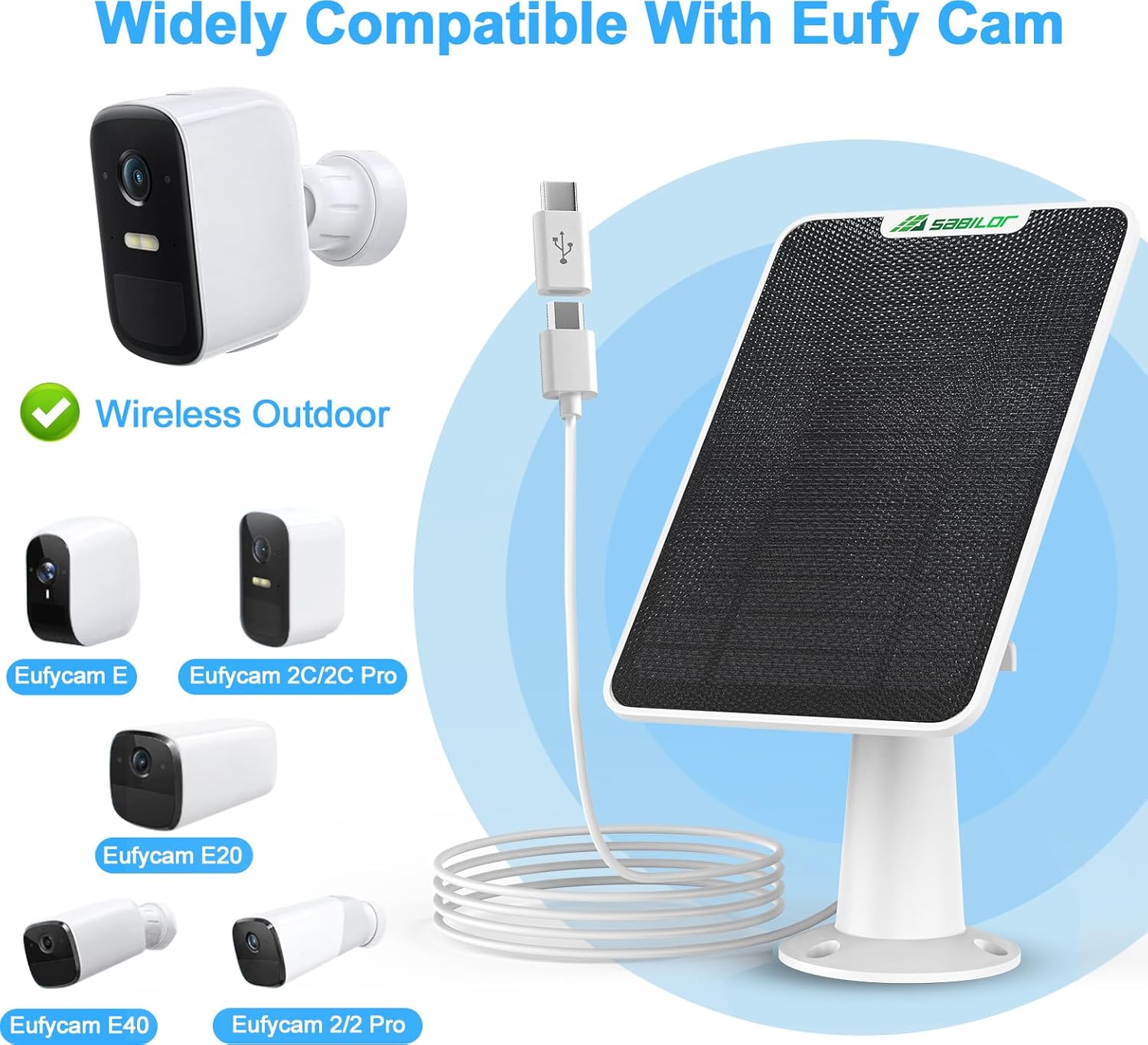The Sabilor Solar Panel for Eufy Cameras is like a tiny sun for your security camera. It works with many Eufy models. These include the Eufycam 2C, 2C Pro, E40, E20, 2, 2 Pro, and E. This solar panel helps keep your camera charged. You will not need to change batteries often. It is a helpful partner for your security equipment.