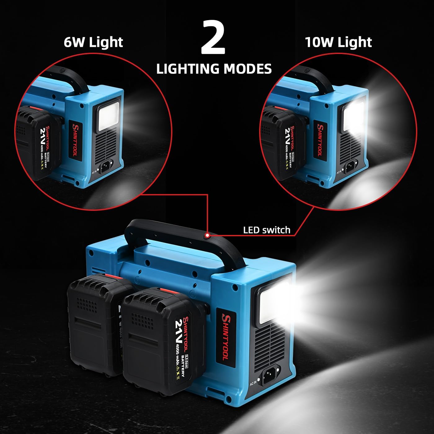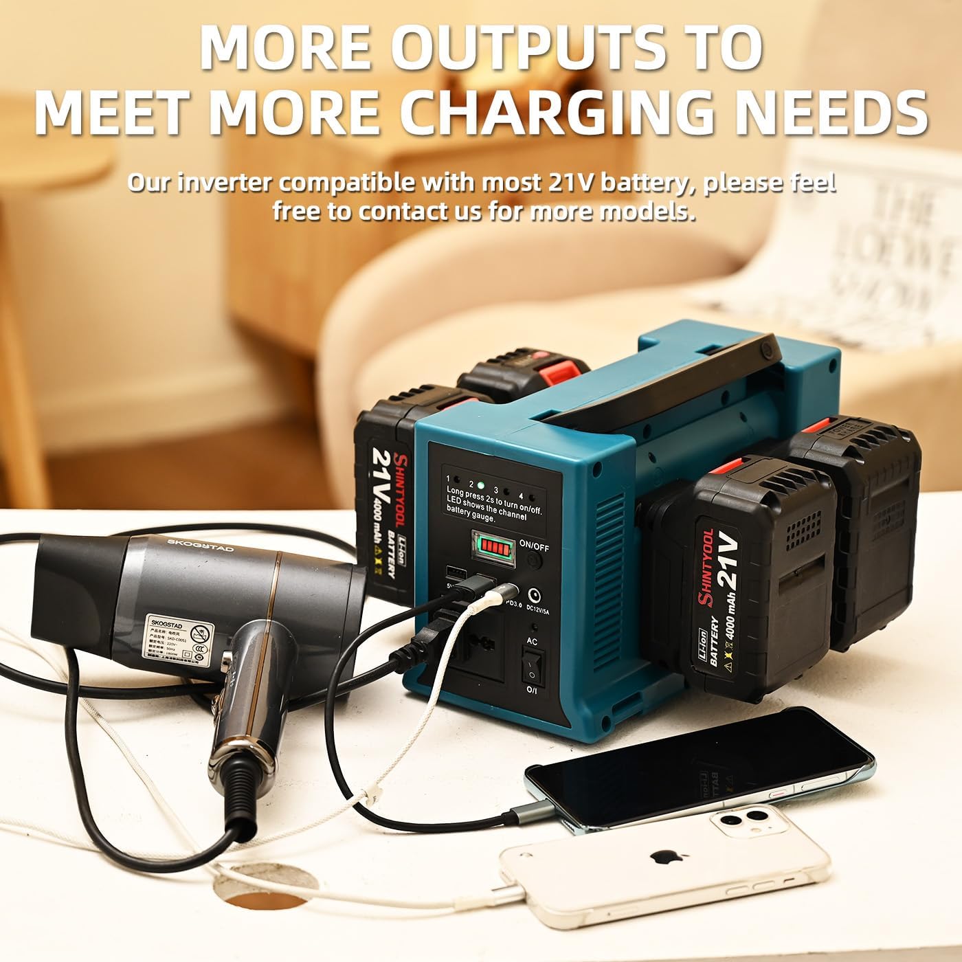 This SHINTYOOL power inverter is a portable power source for outdoor camping. It works with 21V batteries and can quickly charge up to four of them at the same time. It also functions as a pure sine wave inverter to power devices. While it is compatible with Makita batteries, it cannot charge them. This makes it a versatile power solution for various outdoor needs.
