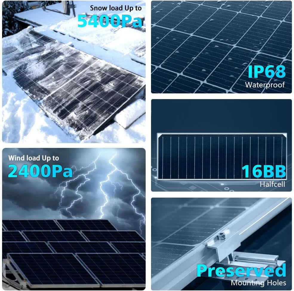 This SGPWOSAY SUNGOLDPOWER solar panel kit includes ten 460-watt panels that can collect sunlight from both sides, thanks to their bifacial design. These panels use monocrystalline PERC cells and a newer N-Type technology, along with 16 busbars, to achieve high efficiency in converting sunlight to electricity. They are built to last and can be used in various setups like charging stations, rooftops, homes, boats, and RVs, for both on-grid and off-grid power systems. Keep in mind that installing bifacial panels needs careful setup to make use of the backside, and with ten panels at 460 watt each, it’s a powerful but potentially heavy and large system that might not be ideal for beginners. Read more…