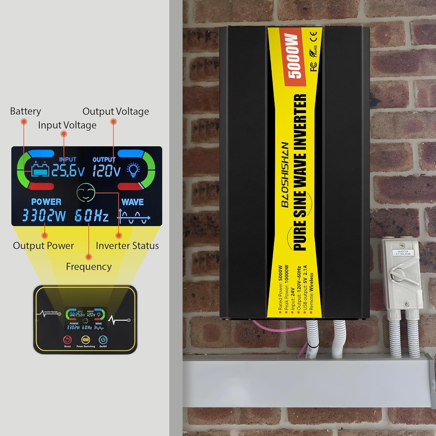 The BAOSHISHAN 24 Volt Pure Sine Wave Inverter is a strong device that changes 24-volt battery power into regular house electricity. It provides 5000 watts of steady power, which is enough for many appliances, and can handle a quick burst of 10000 watts for starting bigger machines. This inverter creates clean, stable power, making it safe for delicate electronics. It’s built tough for off-grid use and comes with a Bluetooth remote for easy control.