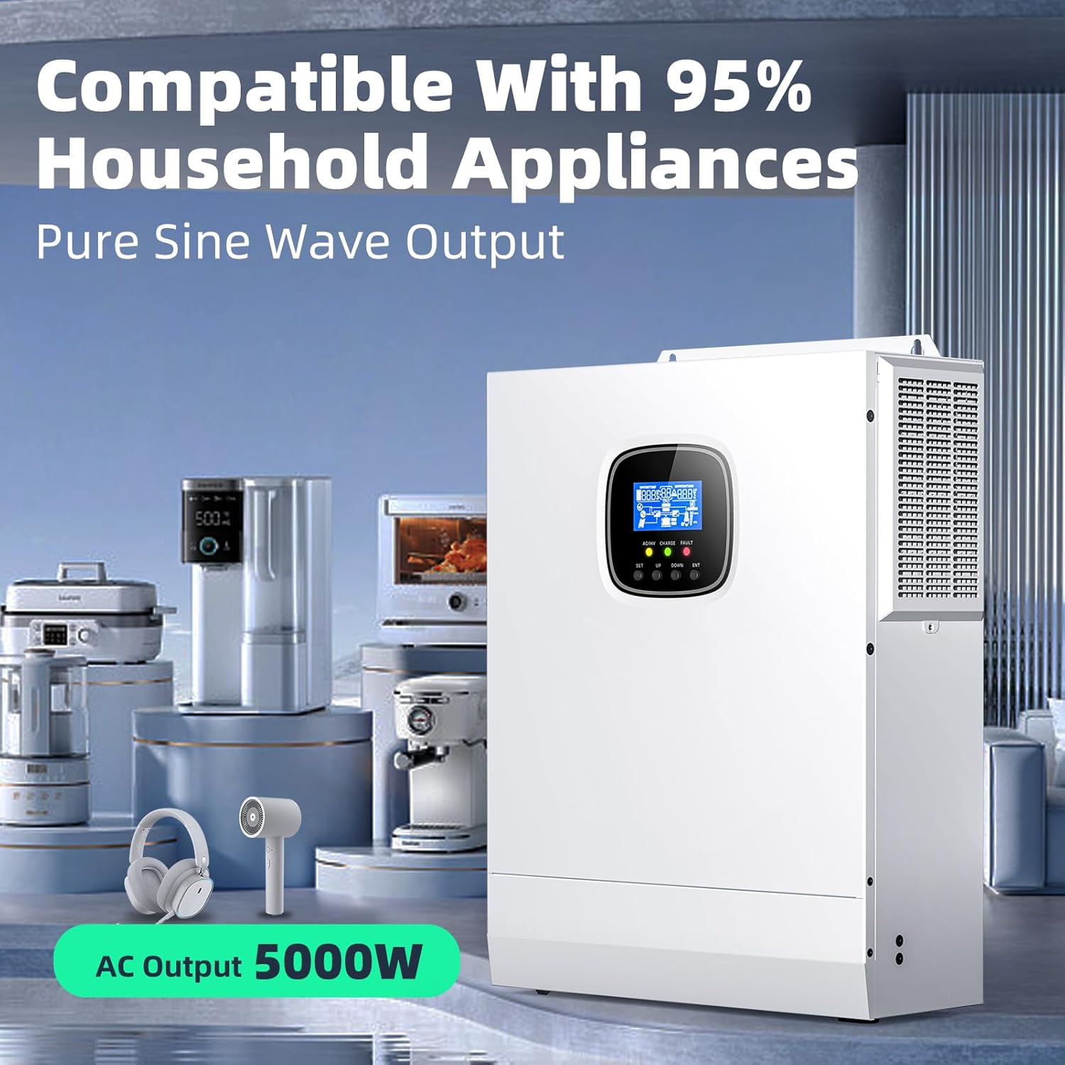 • ✅ 【5KW Solar Hybrid Inverter】This 5000W pure sine wave inverter is a new all-in-one hybrid solar charge inverter, which integrates solar energy storage & means charging energy storage and AC sine wave output. Using the latest optimised MPPT technology, it can quickly track the maximum power point of the PV array with an efficiency of up to 99.9%