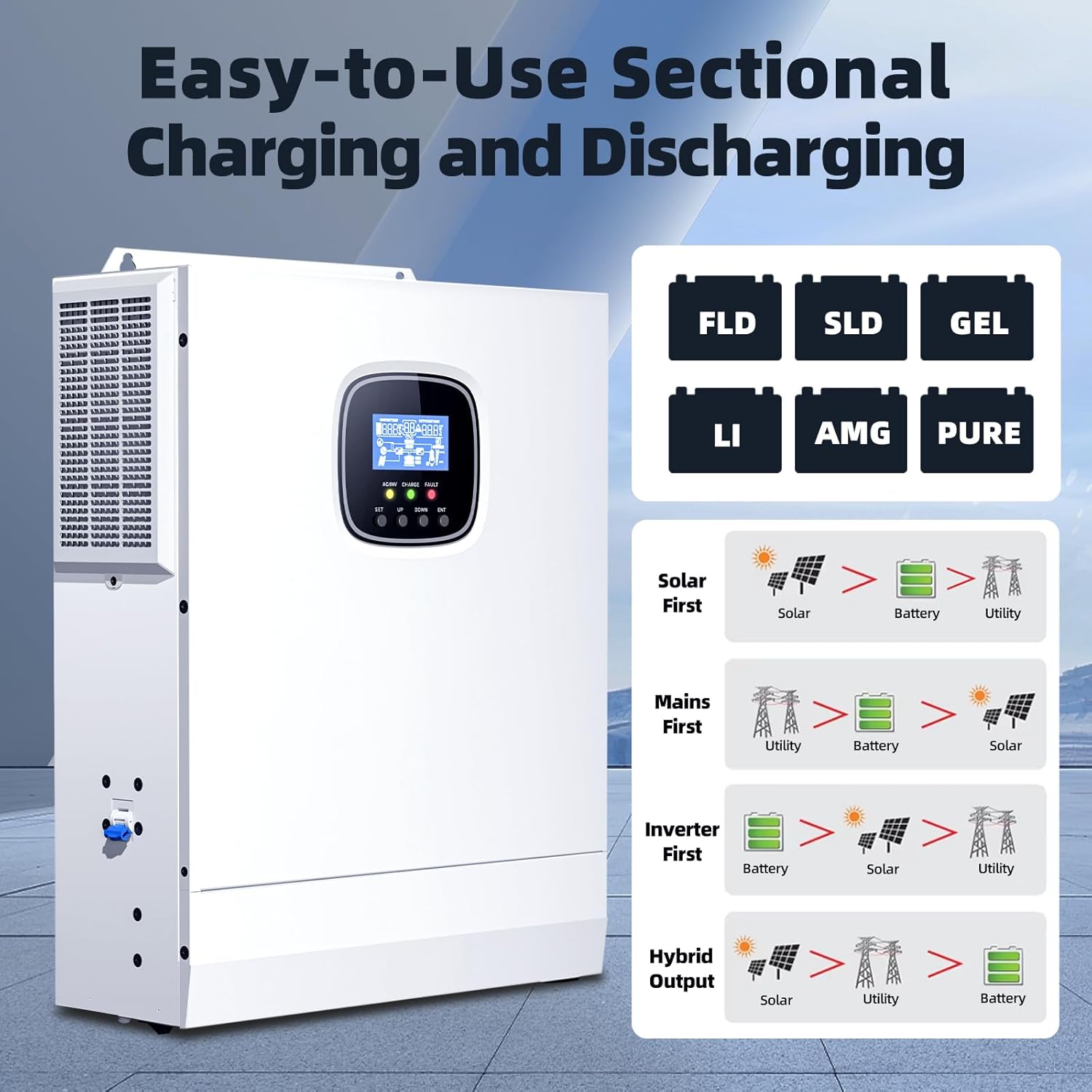 • ✅ 【Flexible Charging & Output Modes】 4 charging modes (Solar Only, Mains Priority, Solar Priority, Mains & Solar hybrid charging) and 2 output modes (Mains Bypass, Inverter Output) cater to all your needs. It's perfect for powering household appliances, power tools, industrial equipment, and AV systems. Compatible with 24V Lead-Acid (Sealed, AGM, Gel, Flooded) and Lithium batteries.
