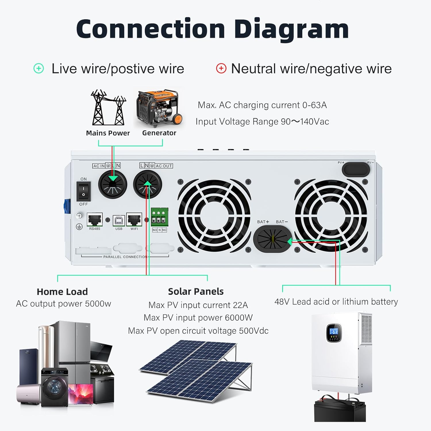 • ✅ 【TECHNICAL SPECIFICATIONS】5000 watt Inverter pure sine wave 48V DC to 120V AC. Max Input Power: 5500W, Voltage range:120-500Vdc, Max input solar current: 22A and Max.Power output: 5000W, max charge current: 80A. AC input Voltage range: 90-140V, Output 100/105/110Vac ±5%. PV Starting voltage >150V