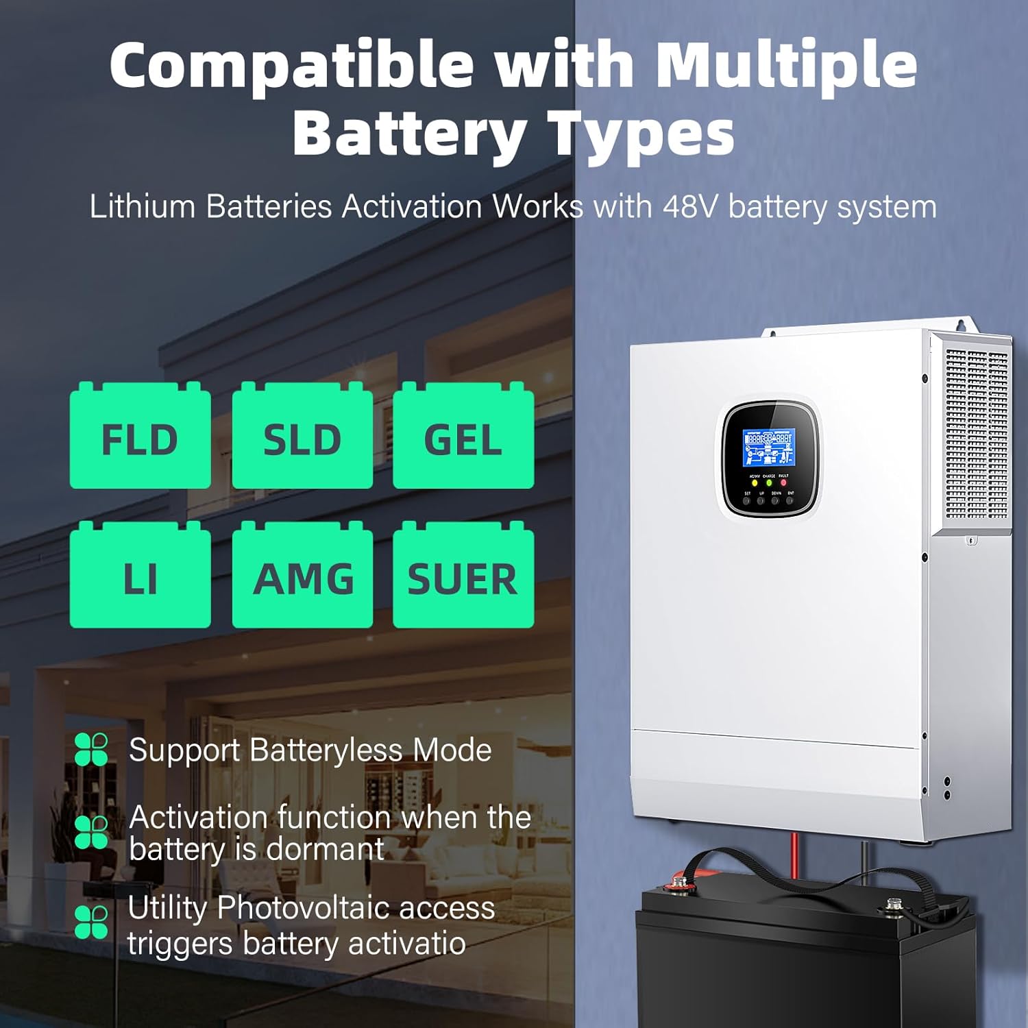 • ✅ 【Compatible with various batteries】Compatible with various batteries such as AGM, Gel, Lead-acid, Lithium-ion and LiFePO4 batteries, and support Batteryless mode: can power the loads from PV/AC grid without battery connected