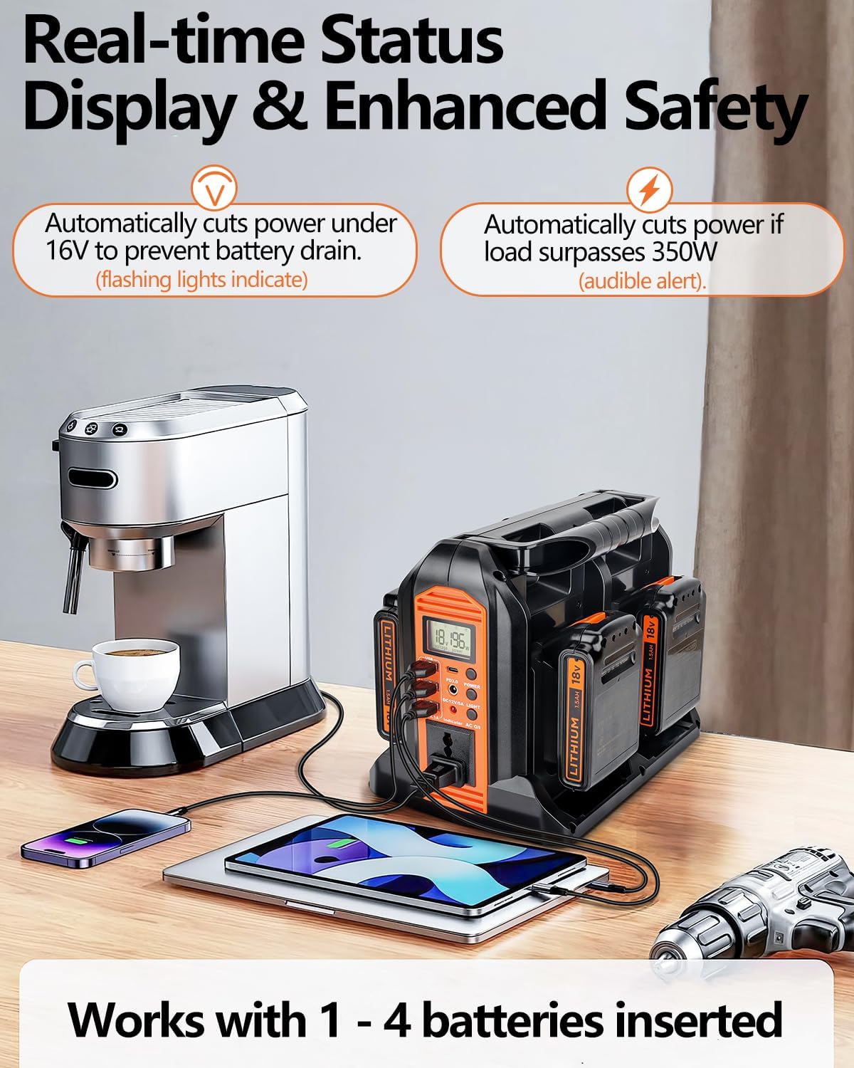 The Taingwei 350 watt Power Inverter turns your Black+Decker 20 Volt battery into a portable power station. It provides pure sine wave AC power (110-120V), which is safe for sensitive electronics. It also has three USB-A ports and one USB-C port for charging phones and other devices, plus a 300-lumen LED light. This “tool only” inverter is perfect for camping, travel, or emergencies when you need power on the go.