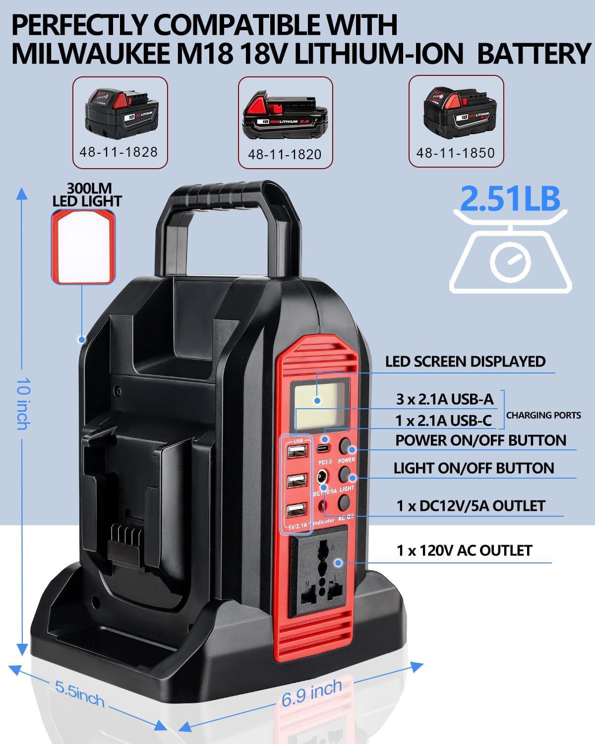 The Taingwei 350 watt Power Inverter is a handy device that turns your Milwaukee M18 18 Volt battery into a portable power source. It provides 350 watts of pure sine wave AC power through two standard outlets, along with three USB-A ports and one USB-C port for charging smaller electronics. It also has a built-in LED light, making it useful for camping or emergencies. Keep in mind that it’s just the inverter (no battery included), isn’t waterproof, and the battery may drain quickly with high-power use. Read more…