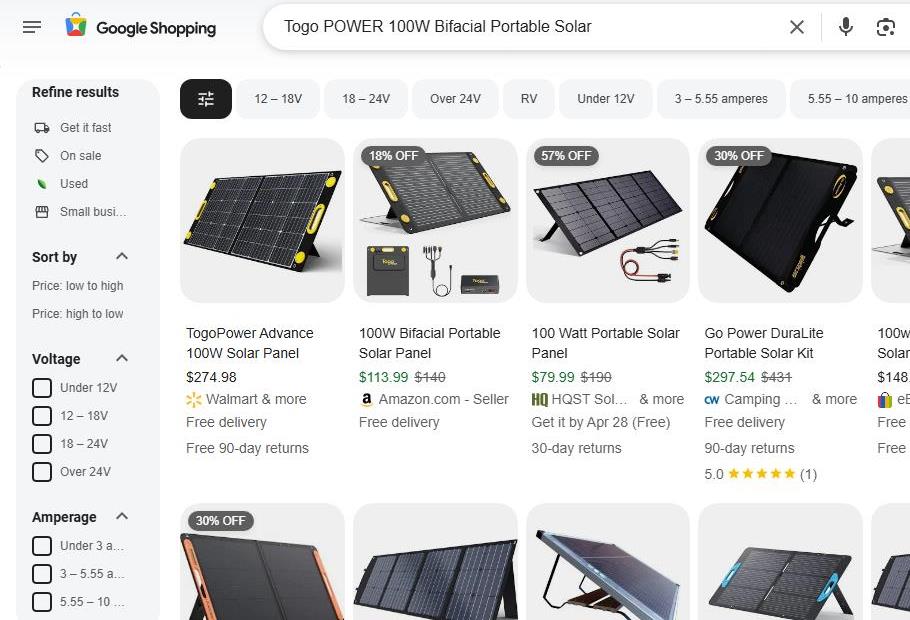 Google Shopping Search Results for Togo POWER 100 watt Bifacial Portable Solar Panel