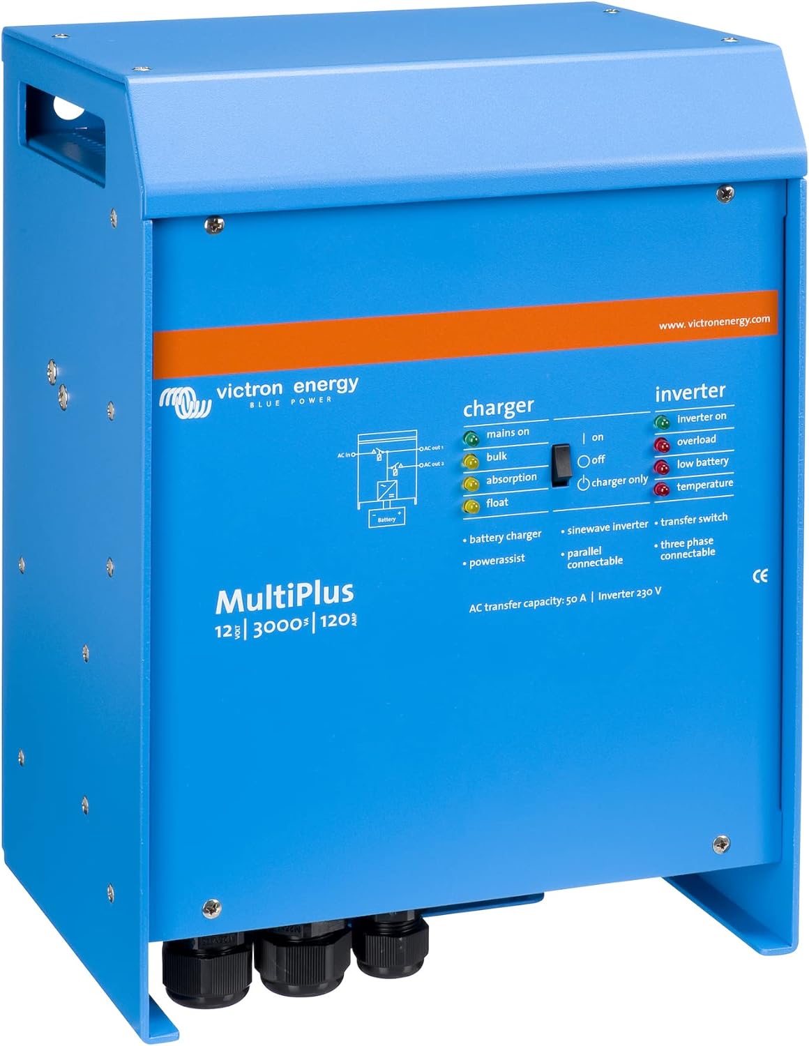 The Victron Energy MultiPlus is like a helpful tool that does two main jobs for electricity. First, it’s an inverter, which means it can take the power stored in 12-volt batteries and change it into the kind of 230-volt power that many appliances use and it does this in a smooth way called “pure sine wave.” Second, it’s a strong 120 amp battery charger, so it can quickly refill your 12-volt batteries when you have a power source. It also has a 50 amp transfer switch, which is like a smart traffic controller for electricity, automatically switching between different power sources like a wall outlet or a generator. This MultiPlus model from Victron Energy is a reliable way to manage and use electrical power from batteries for various needs.