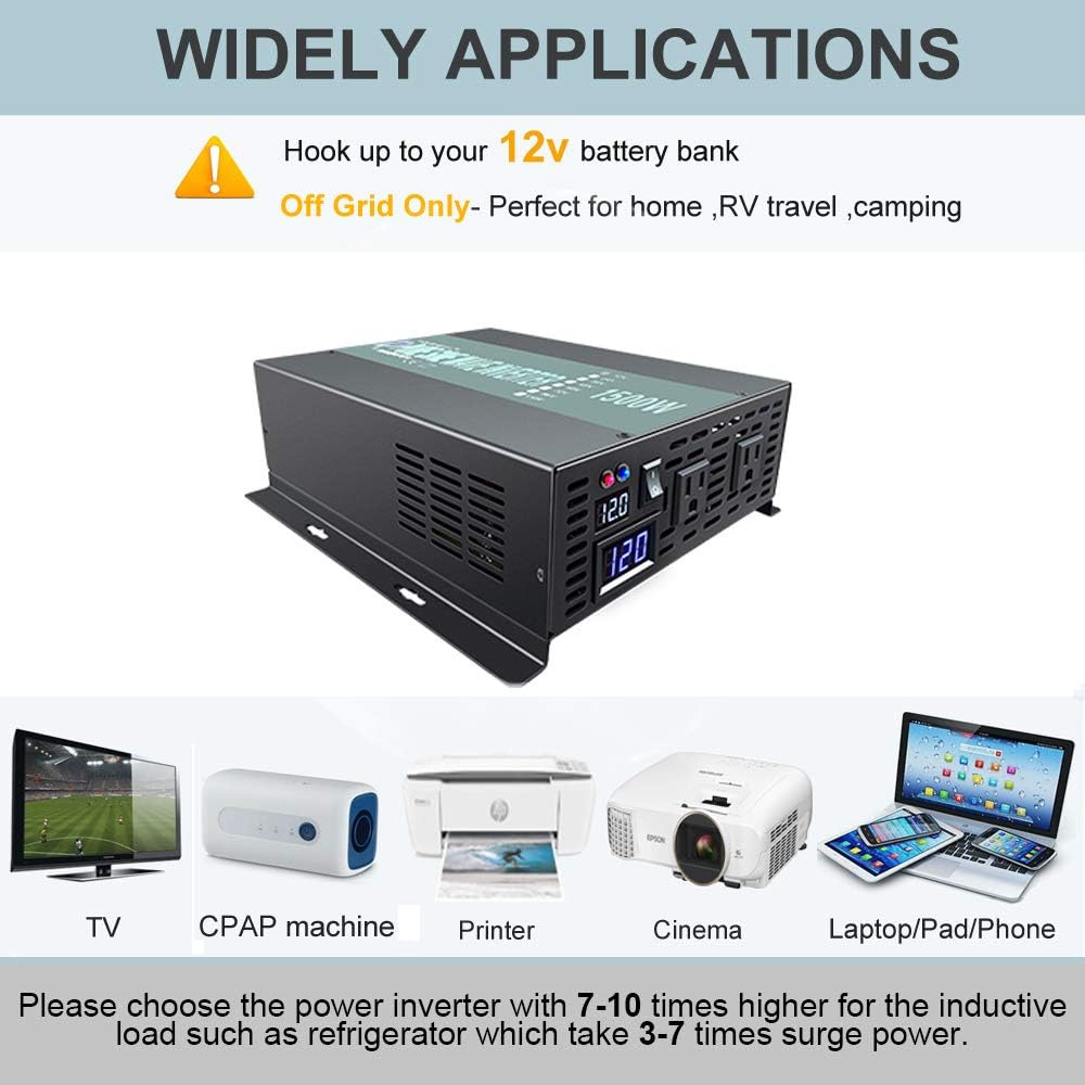 • ✅ 【Pure Sine Wave】Provides 1500 watt pure sine wave DC 12 volt to AC 120 volt continuous stable output power ,60HZ ,single phase, high frequency, ideal for motorhome, emergency household power supply back-up, car vehicle camping, industrial, etc.