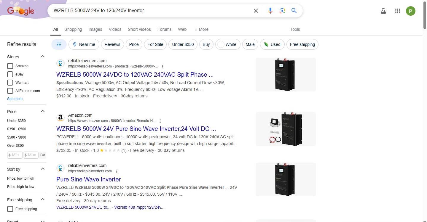 This image shows a Google search results page for a ‘WZRELB 5000W 24V to 120/240V Inverter’. It lists several websites where you can buy the product, including Amazon and eBay. The search results also provide information about the inverter’s specifications, such as its wattage and voltage. The image shows the layout of a typical Google search results page with filters and sorting options on the left and product listings with images on the right.