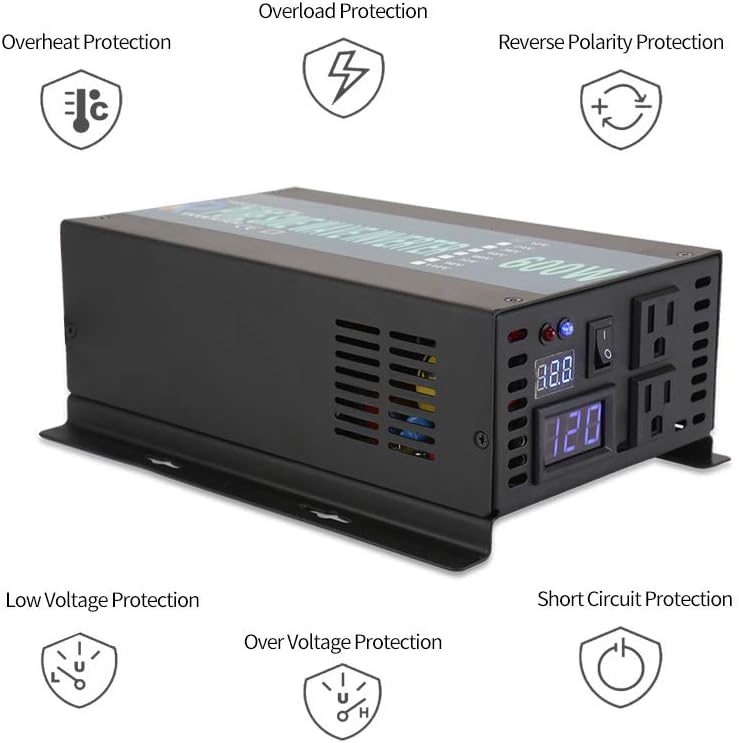 • ✅ 【WELL-BUILT 600W PURE SINE WAVE INVERTER/ 1200W PEAK POWER】- Advanced pure sine wave technology, convert the stable quality current to your electronics and home appliances. Run equipment just as smoothly, no strange buzzing sounds and no when your electronics are turned on.