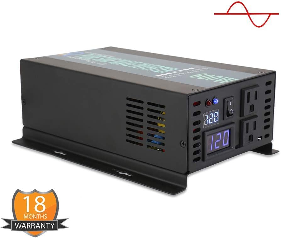• ✅ WZRELB 600W 12V DC to 120V AC pure sine wave inverter generator, as good as Grid power, 3000W continuous power, 6000W peak power, with LED displays for DC AC voltages. Dual US outlets and a terminal for output.