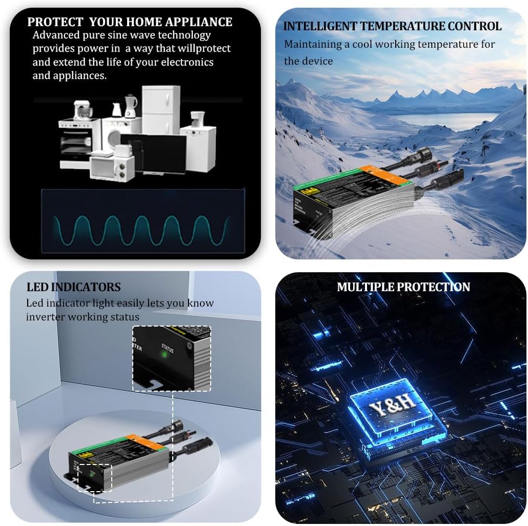 This Y&H 700 watt grid tie inverter is a device that helps you use energy from solar panels. It has a smart technology inside, called MPPT, that helps get the most power from 24 Volt or 36 Volt solar panels. The inverter takes the power from the panels (between 34 Volt and 46V) and changes it into electricity that can be used in your home (90 Volt to 140V). It’s easy to set up and connects to the electricity grid, allowing you to power your appliances with the sun’s energy.
